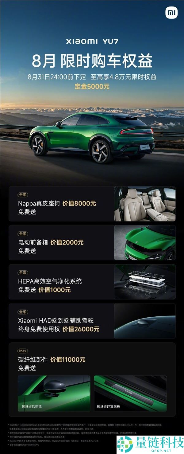 7月25日消息,小米创办人雷军表示,小米YU7首销期权益7月底结束,请大家抓紧时间。据悉,小米YU7 8月份购车权益包括赠送Nappa真皮座椅 电