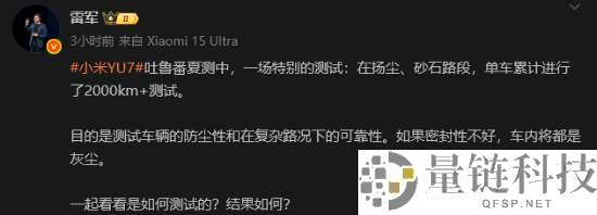 8月11日消息,雷军刚刚透露称,小米YU7在吐鲁番夏测中,进行了一场特别的测试:在扬尘、砂石路段,单车累计行驶超过2000km。目的是测试车辆