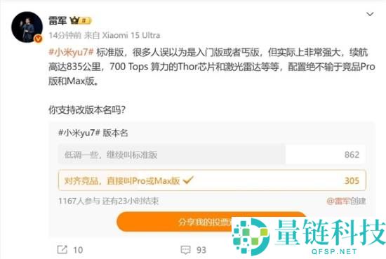据快科技报道,小米创办人雷军发文表示,很多人误以为小米YU7标准版是入门版或者丐版,但实际上它非常强大,续航高达835公里,700TOPS算力