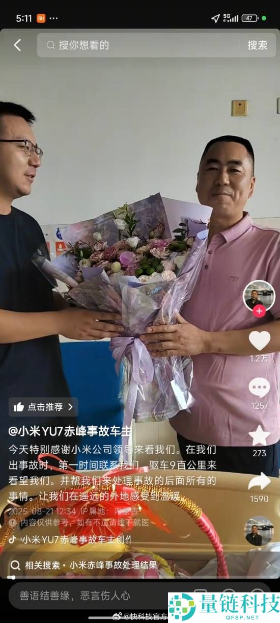 近日,遭逆行水泥罐车撞击小米YU7车主在社交平台发视频称,特别感谢小米公司派人来看望我们。YU7车主说到:“在我们出事故时,第一时间联系