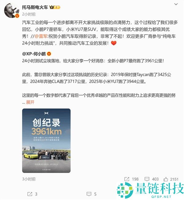 雷军祝贺小鹏创纯电车24小时耐力测试里程纪录!小鹏总裁:我们都很优秀