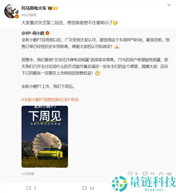何小鹏:全新小鹏P7预售订单已创历史车型新高