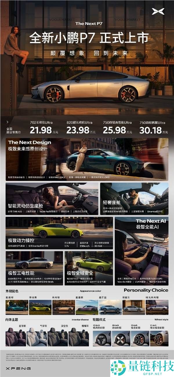 刚刚,全新一代小鹏P7上市,共推出款4车型,售价区间21 98-30 18万元!该车采用了赛博未来感十足的设计,车头配备一体式无断点的光翼贯穿日