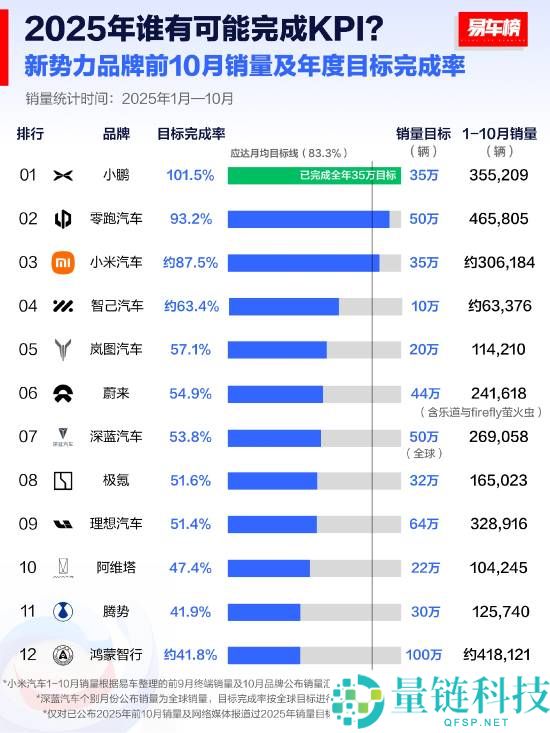 易车榜日前公布了新势力品牌前10月销量及年度目标完成率榜单。新势力品牌销量前十二阵营中,只有小鹏、零跑、小米汽车三家,有望达成全年销