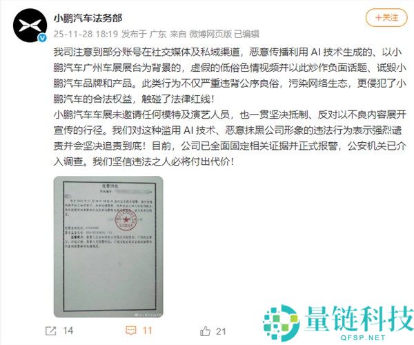 11月28日消息,今日晚间,小鹏汽车法务部严正声明:坚决打击AI技术滥用及恶意抹黑行为,已启动法律追责程序。原文内容如下:我司注意到部分