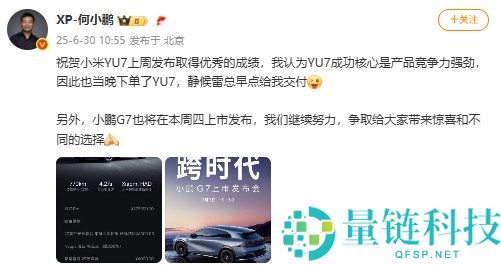 站长之家(ChinaZ com)6月30日 消息:今日小鹏汽车CEO何小鹏发文透露自己下单了小米YU7。何小鹏在文中首先祝贺小米YU7上周发布取得优秀成