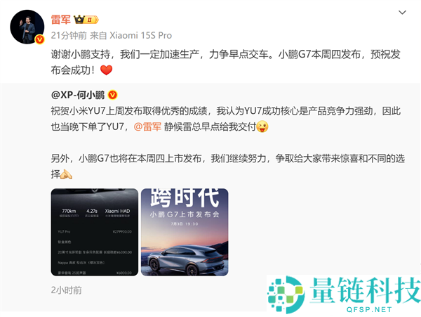 雷军回应何小鹏下单小米YU7:我们一定加速生产力争早点交车 祝小鹏G7发布成功