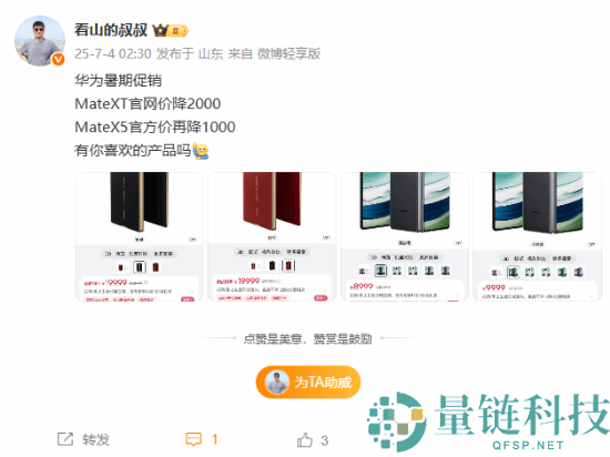 今日,数码博主“看山的叔叔”发文称,华为暑期促销,Mate XT官网降价2000元、Mate X5官方价再降1000元。华为商城显示,购买华为Mate XT