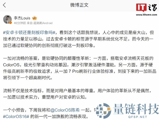 IT之家 9 月 15 日消息,一加中国区总裁李杰今日围绕“安卓卡顿还是刻板印象吗”这一话题发表了自己的观点。他称,人心中的成见是座大