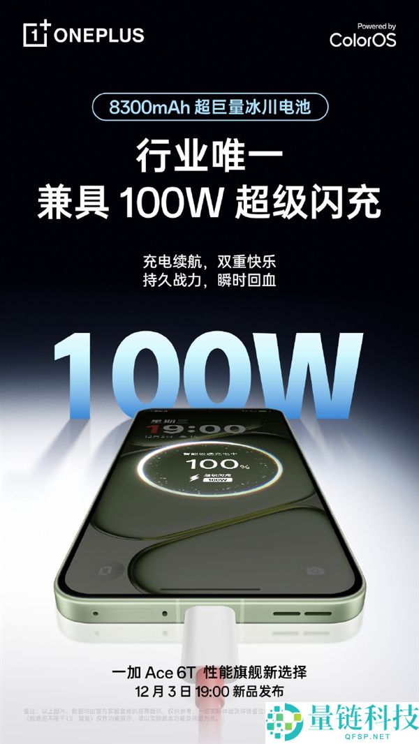 11月28日消息,一加手机中国区总裁今日官宣,全新的一加 Ace 6T 将全球首发 8300mAh 冰川电池 100W 超级闪充,成为目前行业内唯一同