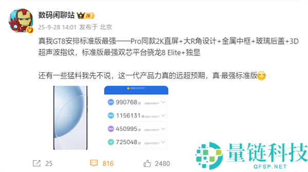应战最强规范版,真我GT8跑分出炉,骁龙8至尊版+16GB内存