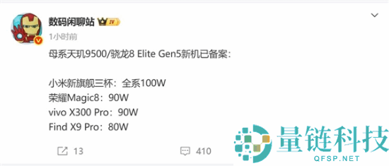 快科技9月3日消息,博主数码闲聊站爆料,首批骁龙8 Elite Gen5、天玑9500旗舰已经备案,包括小米16系列、荣耀Magic8系列、vivo X300系列