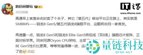 博主数码闲聊站今日爆料称,高通其它「第五代」移动平台正在路上,其实就是 SM8845—— 骁龙 8 Gen5 第五代骁龙 8 旗舰平台,这