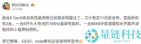 博主 @数码闲聊站 今日爆料称,骁龙 8 Gen5 芯片暂定 11 月底发布,首批新机有 2 台,一台 8 开头大电池的 165Hz 直屏性能机
