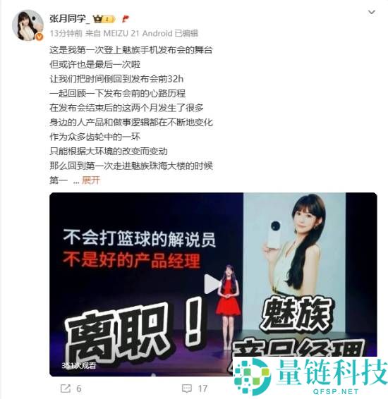 星纪魅族美女产品经理张月通过个人微博透露,自己首次登上魅族手机发布会舞台后,将结束这段职场旅程。从2025年2月入职到7月离开,其在魅族