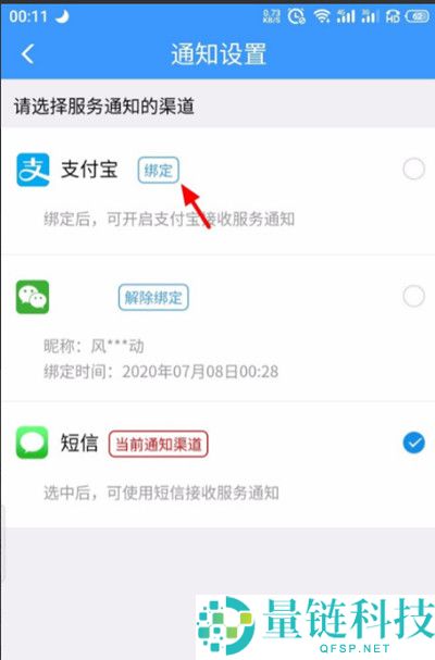 4、在通知设置的页面中,用户通过点击支付宝功能选项右侧的绑定选项,进入到支付宝账号绑定页面。