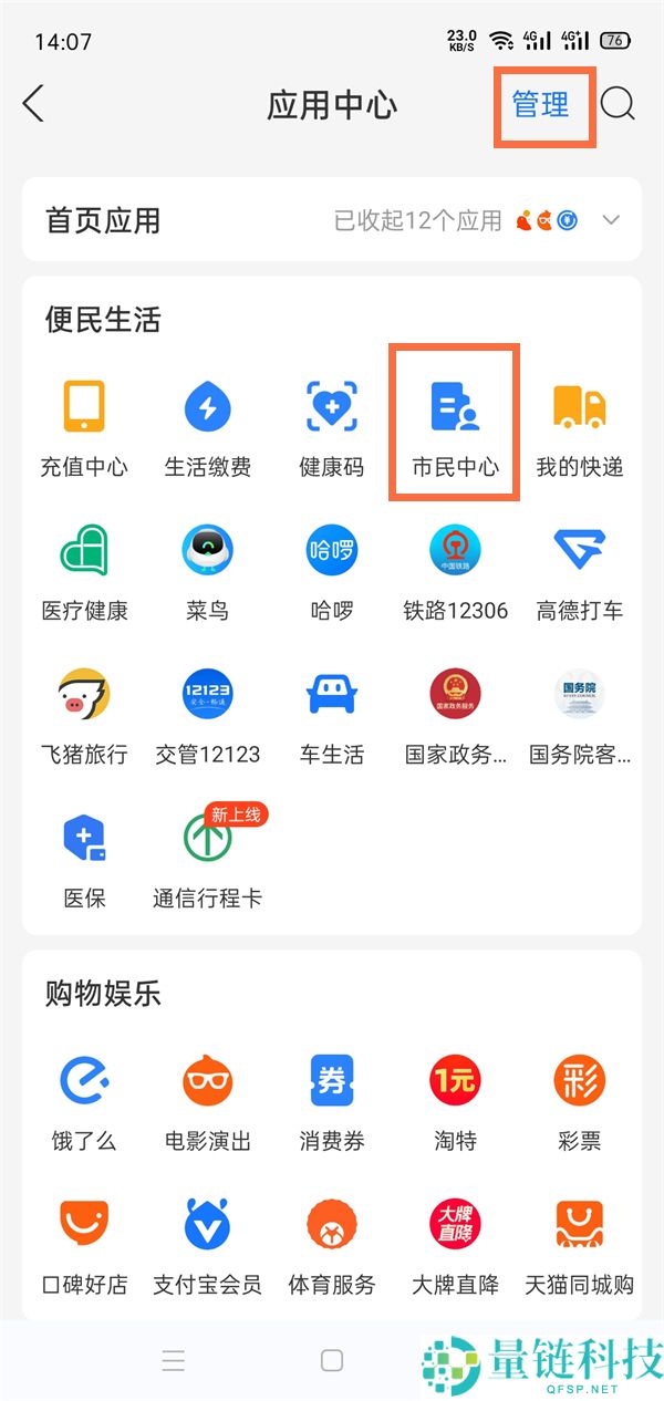 2、点击市民中心即可进入到城市服务功能,还可以将市民中心添加到支付宝首页,点击管理。