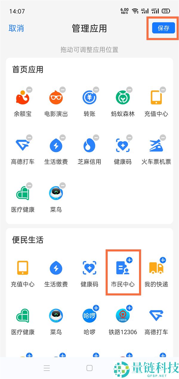 3、点击市民中心右上角的加号后,点击保存即可把市民中心保存在首页。