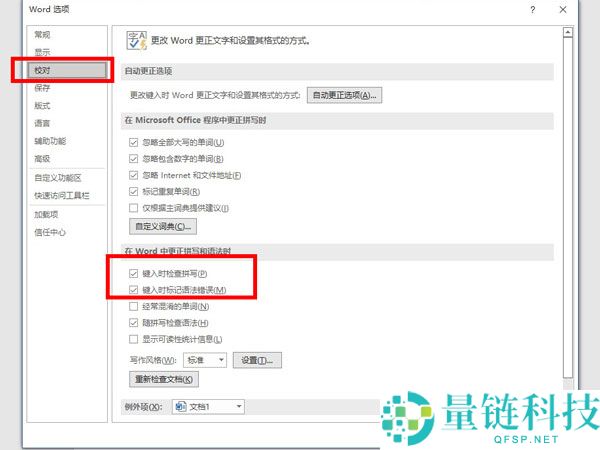 第三步:点击【校对】,取消勾选【键入时检查拼写】和【键入时标记语法错误】,点【确定】。