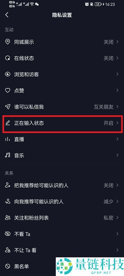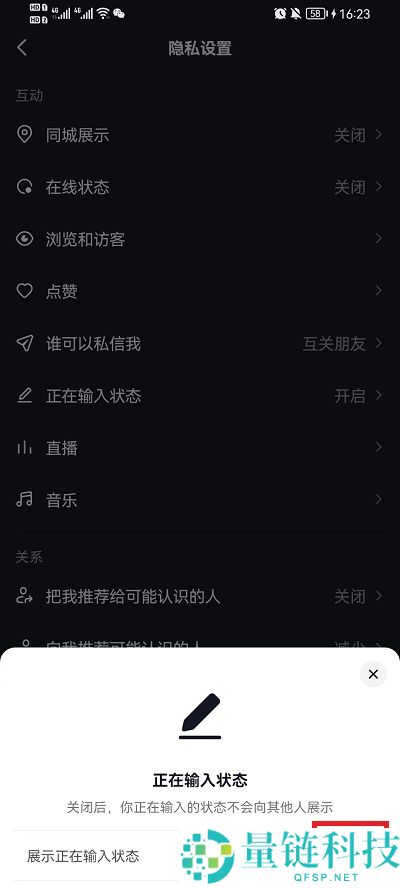 4、在该隐私功能中,就可以找到【正在输入状态】点击打开;