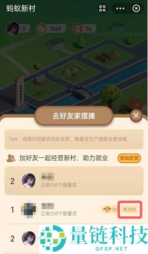 2、选择下面的去好友家摆摊,开通了蚂蚁新村的好友会显示有空位。