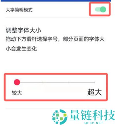 4、进入之后,点击大字简明模式右边的开启选项,然后把下面的红色小点拉到最右边。