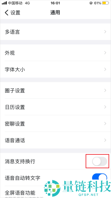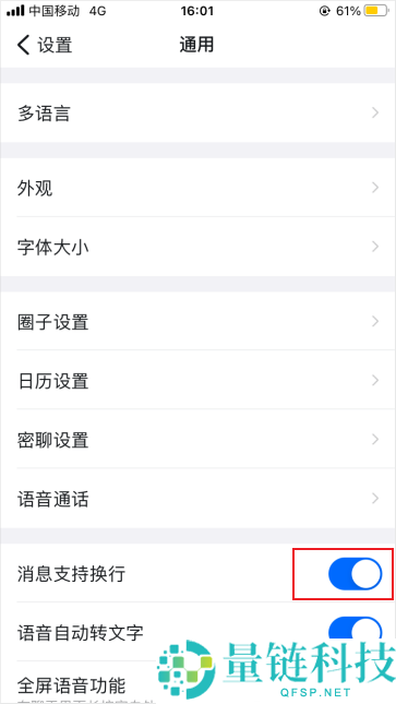 6、当滑动开关切换成蓝色时,表示消息换行已开启。